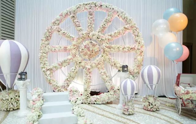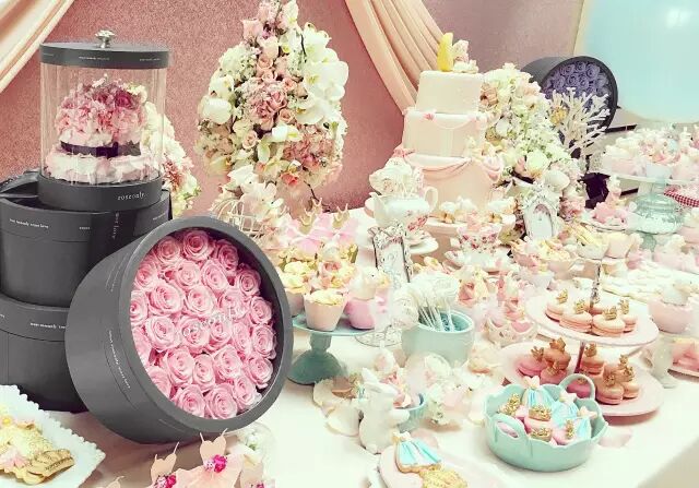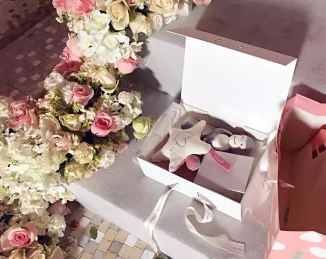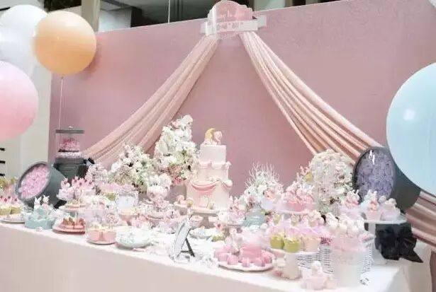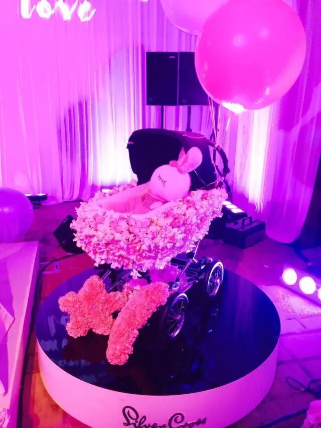 全场被粉色和白色相间的花束环绕,梦幻的摩天轮,还有各式各样可爱迷你的甜品,仿佛置身于仙境,处处洋溢着甜蜜而又幸福的气息。宴会还有一个特别苏的主题——“被爱唤醒”,寓意小醒醒是因爱而生,小醒醒简直是世界上最幸福的小朋友。