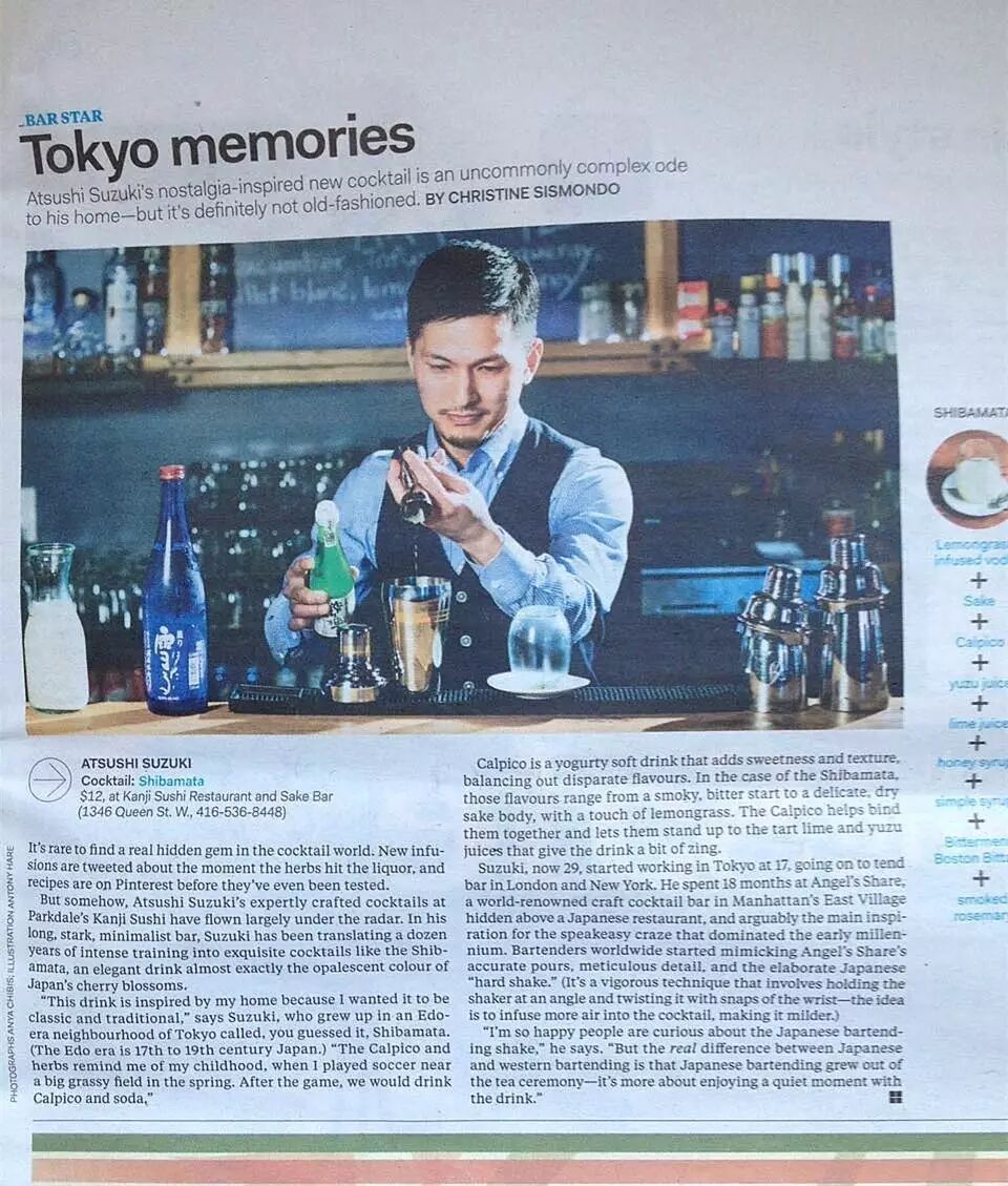 与纽约的梦幻时髦、伦敦的历史感不同,多伦多是一个很悠闲随性的地方,节奏没有那么快。他喜欢这个城市,但一开始没找到什么好的鸡尾酒吧。简历投了很多,最后只有一家寿司清酒吧愿意雇用他。