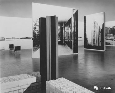 建筑师开始在博物馆、伊朗和双年展中夺得一席之地,艺术家开始接管建筑领域这两种现象在同一时间兴起并非巧合。在由杰尔马诺·切兰(Germano Celant)策划的1976年威尼斯双年展“Ambiente/Arte”中,丹·格雷汉姆建造了他的作品“两种观众:公众空间”(“Two Audiences: Public Space”),一个被隔音木板墙一分为二的方形房间。墙的一侧安置了整面镜子,而另一侧则为白墙。格雷汉姆说威尼斯双年展和其他艺术博览会都像世博会一样,每个国家都有自己的展示馆,而艺术则是里面的商品。在威尼斯,他试图通过将观众引入到展览中来颠覆这个系统。来到展示馆中的参观者将看到自己正在看着自己的景象。他们变成了艺术,变成了商品。格雷汉姆的展示馆使艺术舞台变得复杂化了。观看的主体变成了客体。