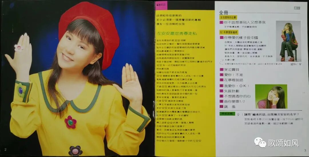 如今提到左安安,很多年轻一辈的乐迷对她的印象应该只是唱片制作人,词曲作者而已,很多人熟悉她的作品比如写给S·H·E的《花都开好了》、《不想长大》,写给莫文蔚的《如果没有你》,写给江美琪的《有个男孩为我哭》等等,很多都成为人们津津乐道的经典作品,也成为如今很多选秀节目中纷纷选唱的作品。现在很少人听过她唱歌,可能只是偶尔在别人的专辑中担纲对唱,比如和范玮琪一起合唱的《不要哭》。其实在30多年前,左安安就曾经以偶像歌手的身份发表过演唱专辑。1992年,左安安签约了台湾华星唱片(上华唱片前身),和李翊君、大小百合、孟庭苇、陈明真等成了同门,同年3月发行了自己的首张个人专辑《你不该想着别人又想着我》。