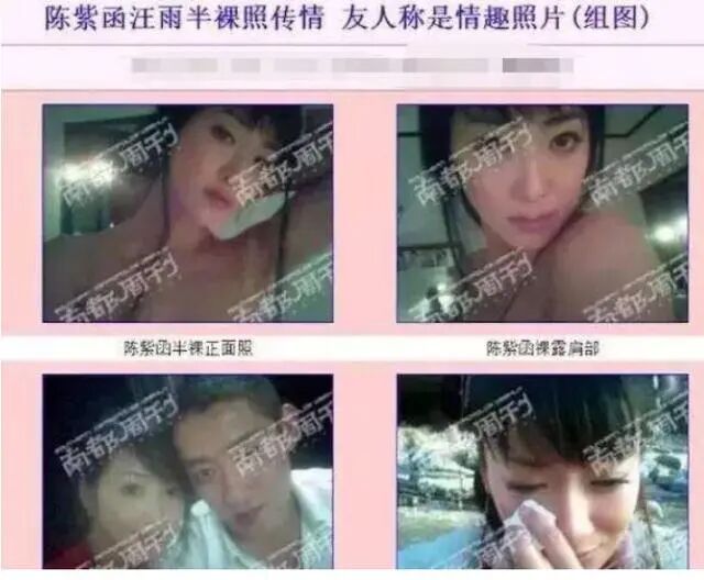她虽然不大火,但是名气还是有的,有一个不知名的网友在国内的某个知名论坛上公开称自己有陈紫函和男朋友汪雨的亲密合照,而且还说需要付费一百才能看这些照片。记者通过这个论坛和这名网友联系,网友知道记者身份后,仿佛看见了发财的机会,还说照片可以打八折,为了取得对方的信任,先发了一张大小为11k的照片给记者看,结果里面的照片还真是陈紫函,从画质来看,确实是手机拍下的,里面陈紫函画了浓妆,还露出了肩部,从她后面的镜子折射可以看出陈紫函是没穿衣服的,这个人声称是捡到一部手机,从里面的下载的这些照片。