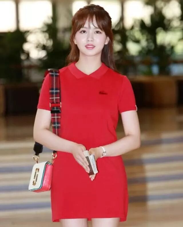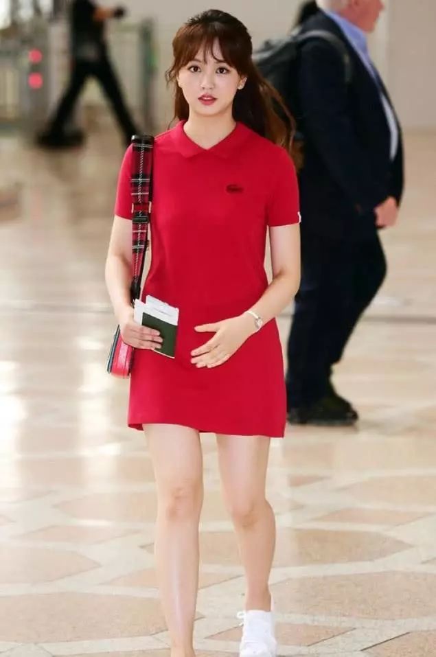 金所炫亮相机场,她身穿着一款大红色连衣裙,这种POLO款式的裙子无形中带着很运动的气息,偏校园风,而且裙子的颜色又这么亮,很是减龄, 不过她原本也不老。