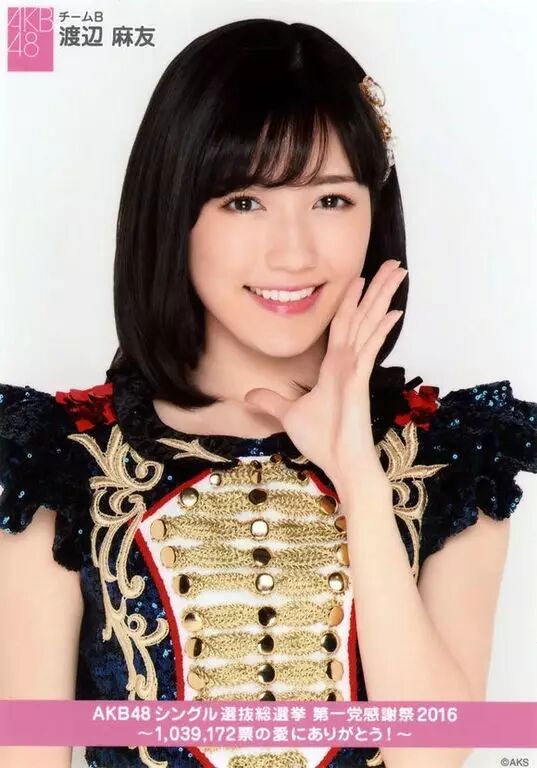 作为三期生加入AKB的渡边麻友如今已经度过了在AKB的第11个年头,作为初代“神七”中年纪最小的成员,在前田敦子毕业后一直被作为接班人来看待,而渡边也一直在努力扮演着肩负起团体未来的领导者的角色。一直以来都被视为总选举第1名的有力候选人,在第六届总选举中摘得桂冠,而今年将会是渡边参加总选的最后一年,不知是否今年她能够得偿所愿为总选生涯画上一个圆满的句号呢。