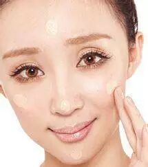 首先分别在五个区域分别点上BB霜,然后由内向外均匀推开来。
