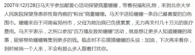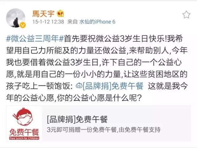 马天宇说过一句不错的话,一个人捐500万元和500万人每人捐助一元这两种情况,他更希望看到后者,因此经常号召粉丝们做善事↓