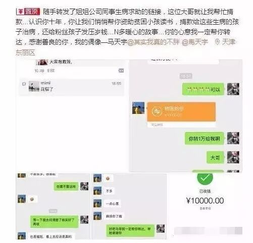 事情是这样的,一位网友最近在微博上,把她让马天宇替自己捐款的信息亮出来了。为一位素不相识、连身份都还没验证的姐姐捐款,一般人可能不会干吧,但马天宇就直接把钱捐了。