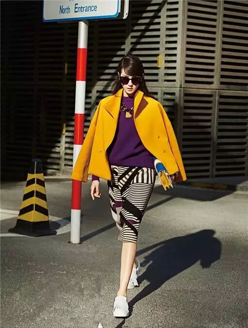 紫色毛衣搭条纹包臀裙外搭黄色短外套