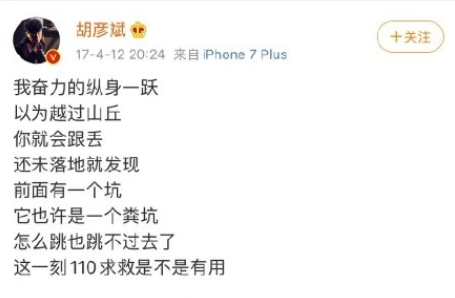 比如17年4月,胡彦斌发布微博,谈论山丘与粪坑。
