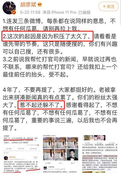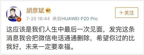 比如,分手之后曾被拍到见面,胡彦斌在微博表示不会复合,而且联系方式啥的都已经删掉了。