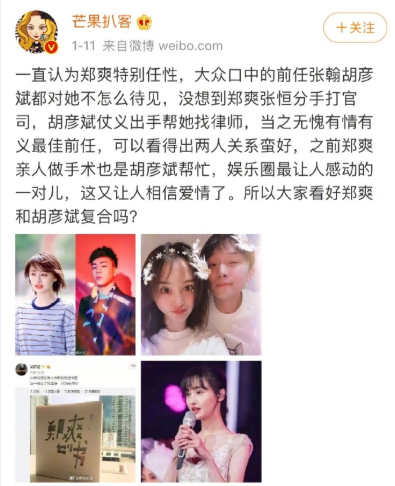那时郑爽和张恒分手后因为经济问题有纠纷,网络盛传胡彦斌帮郑爽打官司,两人还“旧情复燃”。