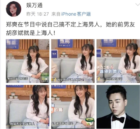 要知道,在郑爽交往的大家知道的三任男友中,其中两任:胡彦斌和张恒都是上海人。