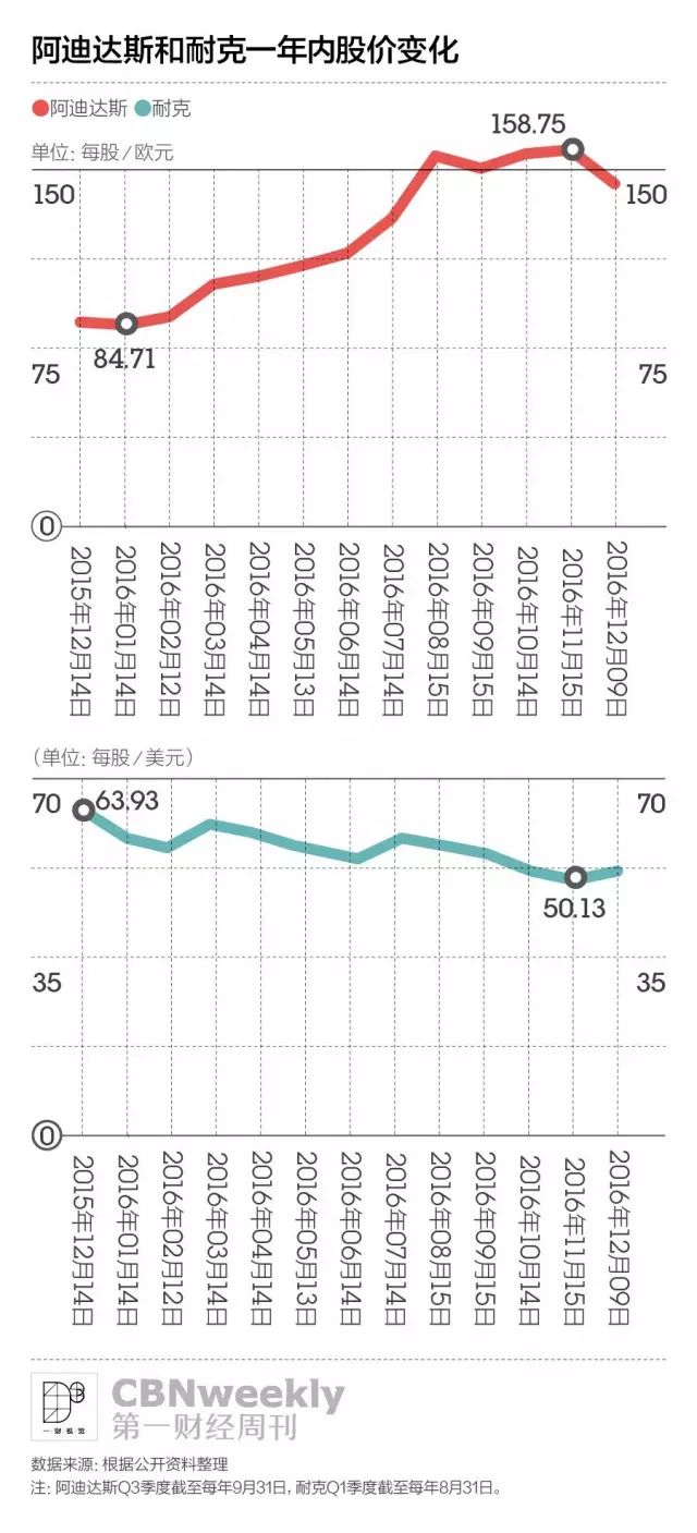 投行也在2016年对这两家运动品牌给出了不同的评级。尽管耐克再三解释财报数据的不理想跟汇率浮动有关,但在过去两个月,美银美林、ZackInvestment和Cowen & Company相继下调了对它的评级,它的股价在一年之内缩水了20%。反观阿迪达斯的股价则走出一条漂亮的上扬曲线——2016年年初它还在每股84欧元左右徘徊,12月9日已经涨到了每股145欧元。