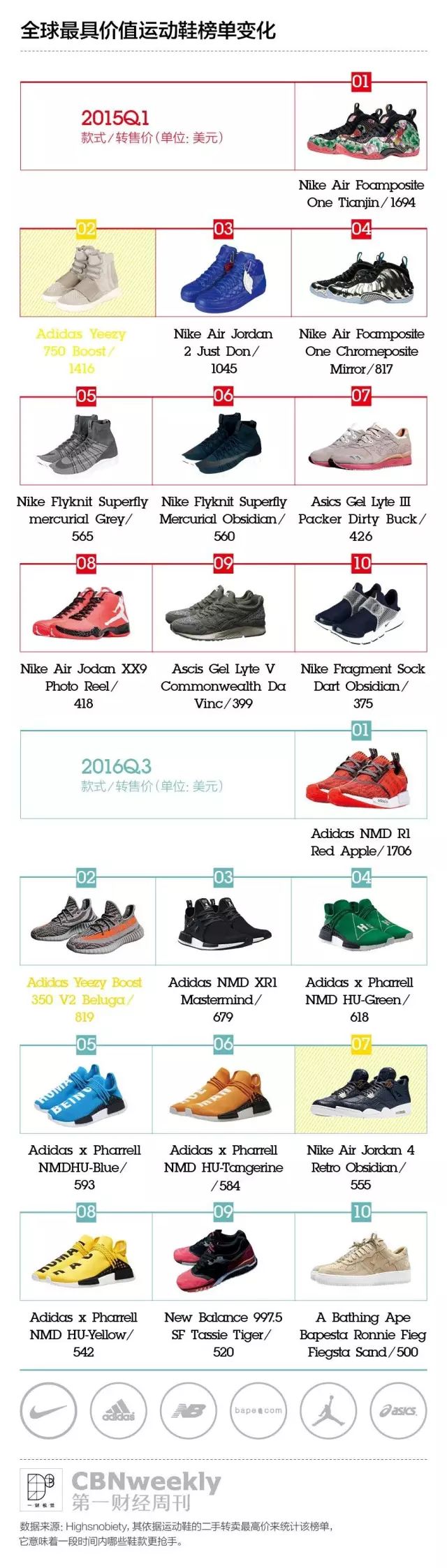 Johnson并没在胡言乱语,阿迪达斯的确站在了2016年运动鞋市场甚至时尚界的中心。全球性潮流网站Highsnobiety会依据运动鞋的二手转卖价来定期统计“全球最有价值运动鞋”榜单,它被视为当下热门鞋款的风向标。在2016年第三季度的TOP10榜单中,阿迪达斯的Yeezy Boost和NMD占据7席,耐克只有一双Air Jordan 4 Retro Obsidian排在第七。