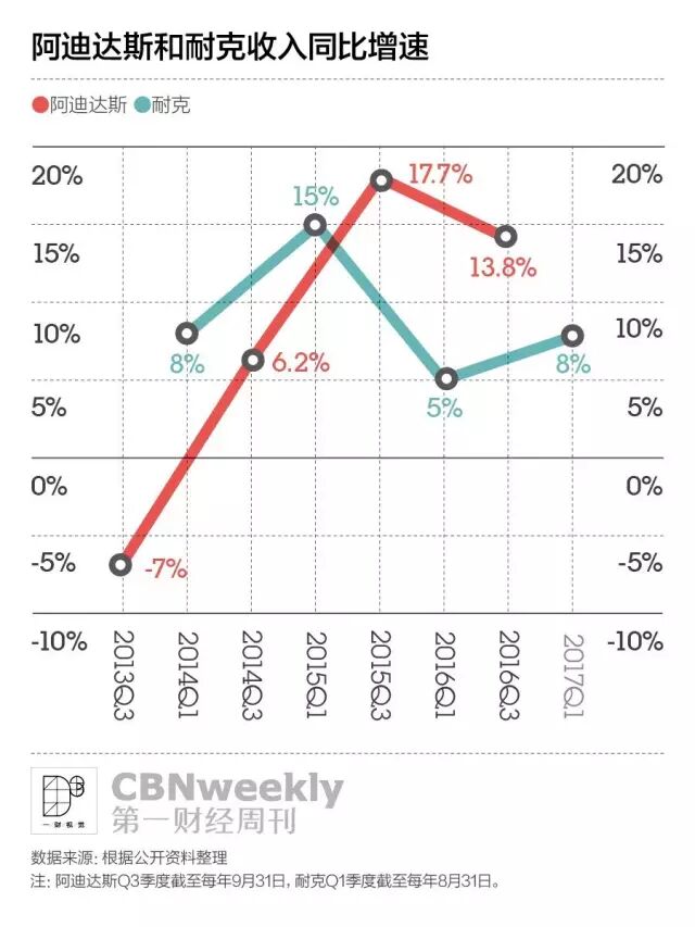 阿迪达斯制造的喧嚣让耐克看上去略显窘迫。在截至2016年8月31日的2017年第一财季里,耐克的营收同比增加了8%,而在2015财年Q1这一增速是15%。同2016财年第一财季相比,耐克的毛利增速下滑了4%,毛利率也减少了两个百分点,有分析师担心,它是否为了和竞品竞争而对产品采取了过度的降价措施。