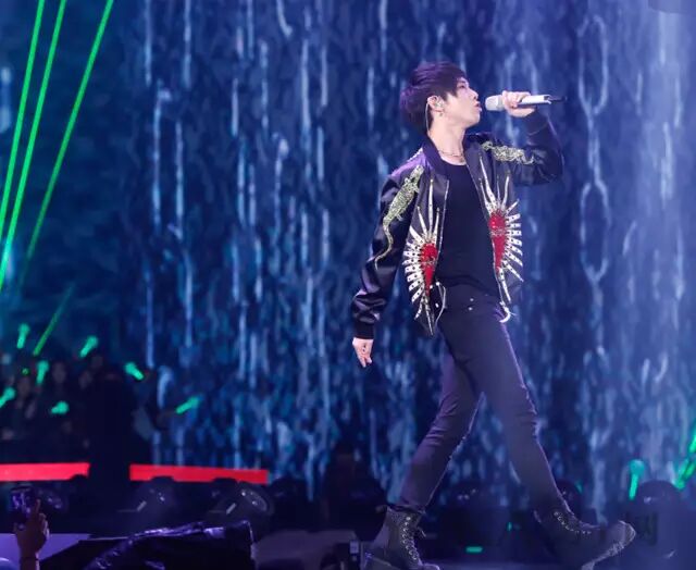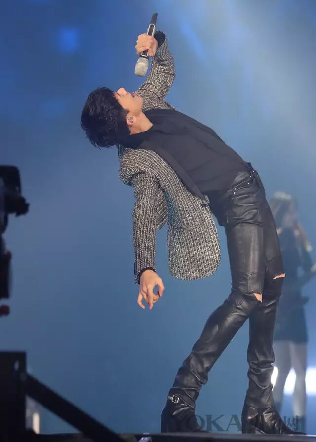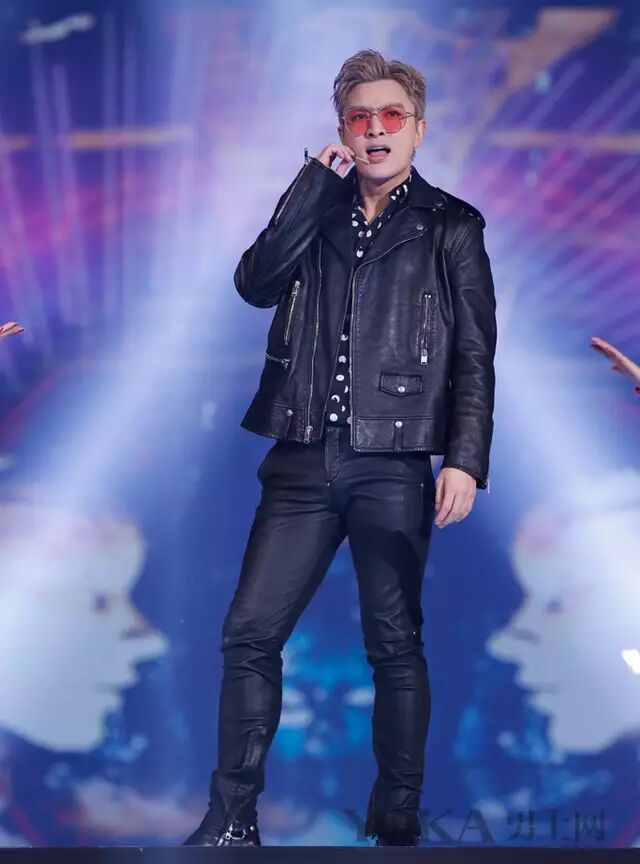 张杰身穿Saint Laurent西服套装+系领衬衫+破洞皮裤,脚踩中跟皮靴,要的就是这种歌Feel!