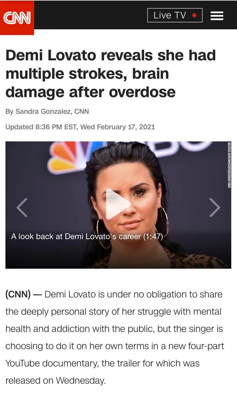 Demi Lovato 首谈吸毒差点死. GooJet 欧美女星 2021-02-18 14:53:51 637 创作不易,用心坚持,欢迎请BaGua喝几杯爱心咖啡!打赏并支持本文 打赏并删除本文 Demi Lovato 近日首谈吸毒差点死。她表示自己三年前,用药成瘾的程度很严重,有一次近乎致命的过量用药,导她住院治疗,她有多处中风,心脏病发作。医生告诉她再晚五到十分钟送医她就会死掉。Demi Lovato 透露了她在下个月发行的新纪录片,作为全新青少年戒毒宣传片发行,其中有众多医生以及一系列与健康相关的专家出镜。挺佩服这位姐的,别人有丑闻都是避而不谈,她反而拍成纪录片。 创作不易,用心坚持,欢迎请BaGua喝几杯爱心咖啡!打赏并支持本文 打赏并删除本文 感谢您的支持鼓励,我会继续努力的!文章地址:用户邮箱:打赏金额:USDT 请输入数字点击”去打赏“,即可进行打赏支持本文章哦 Demi Lovato About the Author GooJet 功能介绍:这是一个仙女账号,绝不蹭热度。 Related Posts Shakira 就是我心中的小美人鱼! 2023-06-20 16:02:12 澳大利亚女歌手 Lenka 居然要来中国酒吧表演. 2023-04-07 14:26:42 Vanessa Hudgens 宣布订婚! 2023-02-03 14:21:53 Mariah Carey 永远不是我心中的圣诞女王! 2022-12-25 16:16:36 昔日国际巨星 Aaron Carter 去世! 2022-11-06 16:23:40 发表评论