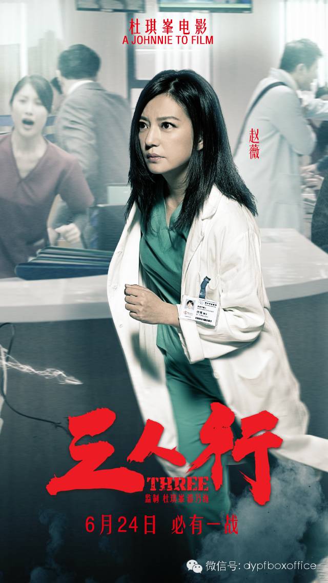 继《PTU》《毒战》之后,《三人行》在杜琪峯领衔的银河映像二十周年之际回归到他最拿手的警匪题材。影片讲述了一个医生(赵薇 饰佟倩)、一个警察(古天乐 饰陈伟乐)、一个悍匪(钟汉良 饰张礼信),在“生、老、病、死”轮回的医院发生的惊心动魄交锋。谈起角色赵薇称:“我演了一个特别的人物,生活当中找不到我这样的医生。我们邀请真正的脑外科医生来片场指导,手术器材也是真的,将近一个月每天都在练习开刀做手术,大家甚至开玩笑说可以出去接活了。”对于杜琪峯的拍摄邀约,赵薇表示初听时特别激动,当时只弱弱地提了一个要求:“不想演大佬背后的女人”,没想到最后杜导却让自己演了一位女大佬。对此杜琪峯透露一直想约赵薇演戏,“拍这部电影她从来不用催,都是化好妆等在旁边,剧组里每一个人都好喜欢她。我很感谢她对电影的态度,非常专业。”