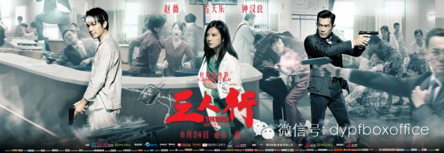 4月14日,由杜琪峯执导,杜琪峯、游乃海监制,赵薇、古天乐、钟汉良主演的警匪电影《三人行》举行定档发布会,宣布将于6月24日抢滩上映,成为暑假档最值得期待的警匪大片。“赵薇+古天乐+钟汉良”巅峰阵容加上“银河二十年杜琪峯回归之作”金字招牌,使电影从开机即成为焦点,高度保密的剧情也吸引外界猜测不断。当日,杜琪峯、游乃海、赵薇、钟汉良悉数亮相,先导预告及先导海报首次对外曝光警医匪三元对立世界,发布会上赵薇和钟汉良“火花四射”的互动也令粉丝尖叫不已。
