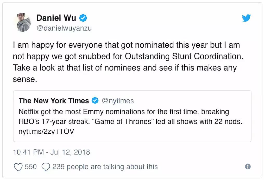 “我们的动作团队的男人女人们每周工作5-6天,持续了9个月。”但别的有些剧“我知道他们一集只会抽出一天、半天、4个小时来拍动作戏份。”所以他为该剧的团队觉得不公,“每天他们都非常努力,豁出命在工作,却得不到奖项的认可,甚至很多人都不知道。”