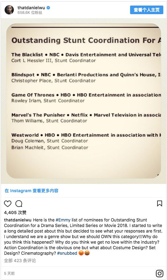 而对于此次入围了最佳武术指导的剧:《权力游戏》、《谍海黑名》、《盲点》、《漫威制裁者》、《西方极乐园》,吴彦祖则表示: