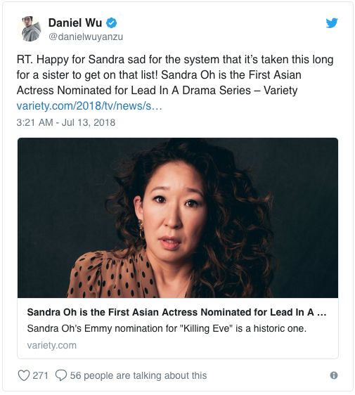 亚裔女星吴珊卓(Sandra Oh)凭借在口碑热剧《杀死伊芙》(Killing Eve)中的精彩表演,成为70年艾美奖史上首位提名最佳女主的亚裔演员。