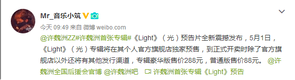 新专辑预售时间来啦!详情看图!!!地址是某宝搜索店铺“许魏洲个人工作室”,可以先收藏哦,时间是5月1日(劳动节!!)具体的内容等待官方或者许魏洲微博进一步更新哦!