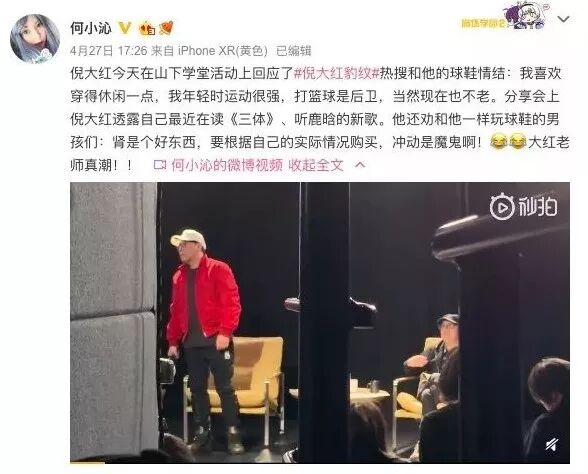 在山下学堂的活动中倪大红透露,最近在读《三体》,还在听鹿晗的新歌。也提到自己曾经热爱篮球,是控球后卫,也是个爱鞋的BOY,并且还不忘提醒年轻人买鞋归买鞋,别伤肾。小词一套又一套。