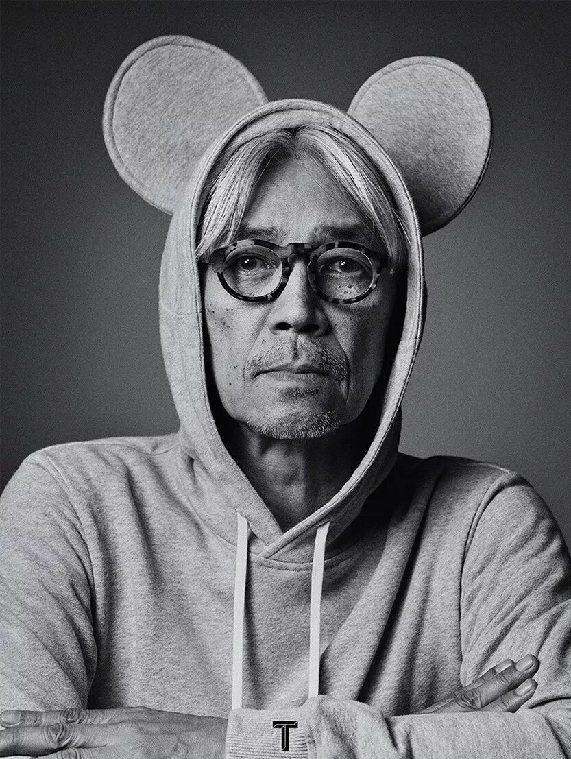 66岁的音乐家坂本龙一穿上COMME des GARCONS SHIRT BOY的老鼠耳朵卫衣拍摄T Magazine的大片,一点没有违和感。