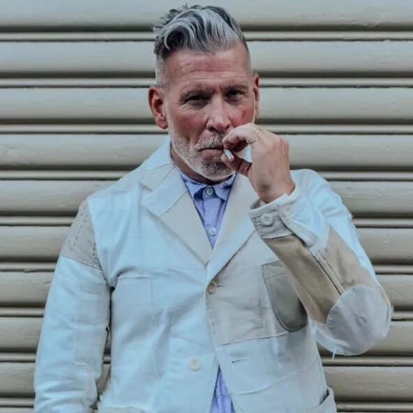 油头、墨镜、花臂、潮流款的西装,如果除开皱纹与白发,你一点不会认为Nick Wooster是一位老者。