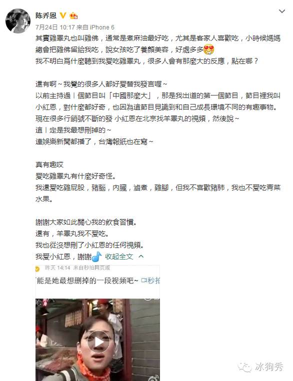 陈乔恩就爱吃睾丸事件作出回应,大方承认自己的确爱吃,尤其是重口味!食品。而且直言吃睾丸还能丰胸啊。
