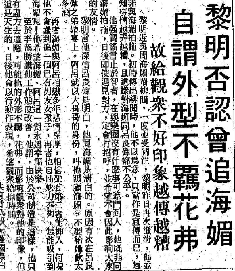 当时两人合作电影《七剑》,还被传互生情愫,媒体写得很有画面感:“两人合照时,黎明更兴奋得手舞足蹈,如斯热情实属少见……”