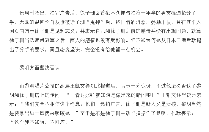 这一次,是结结实实因为广告传了绯闻,据传徐子珊拍完广告就和拍拖一年半的男友分手,而黎明上节目,也点名要和徐子珊一起。