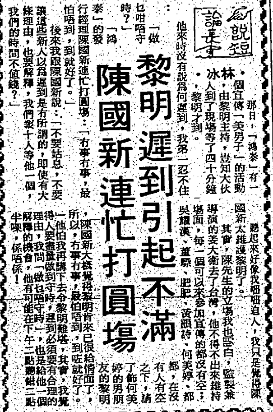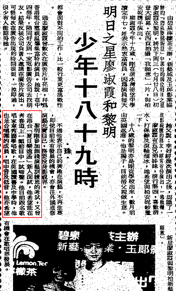 但其实,进亚视培训班,多少是为了学唱歌,跟着歌后韦秀娴学了一段时间唱歌,又去参加无线培训班的考试。折腾来折腾去,多少还是有机会见报,当时的报纸写他“明日之星”,谁会想到那是“明日天王”呢?