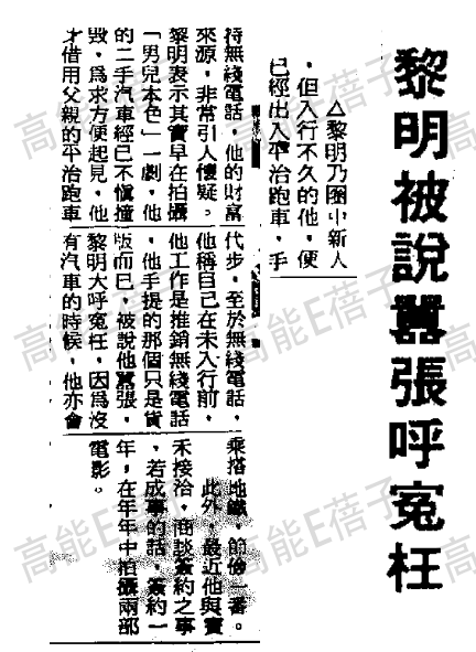对此小黎大呼冤枉,赶忙撇清:自己的二手车在拍《男儿本色》的时候被撞坏了,只好跟爸爸借了跑车来代步,无线电话也是因为他入行前的工作是推销无线电话才有的,手拿的只是货版。