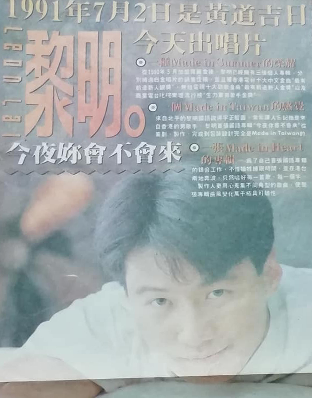 那时黎明也有同步在台湾发展的,感谢之前被无线封杀那段时期,去台湾刷了不错的观众缘回来,1991年便趁热发了第一张国语专辑《今夜你会不会来》。
