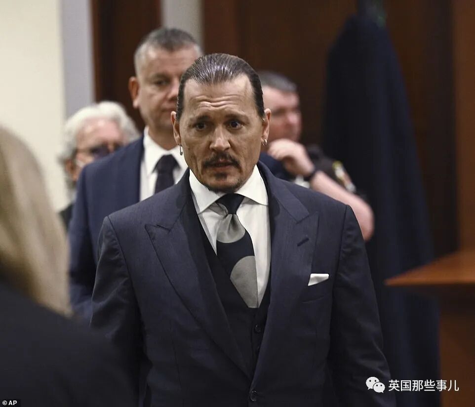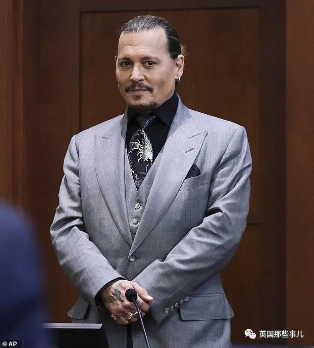 德普穿着西装三件套,把头发扎成马尾,利落又干脆,