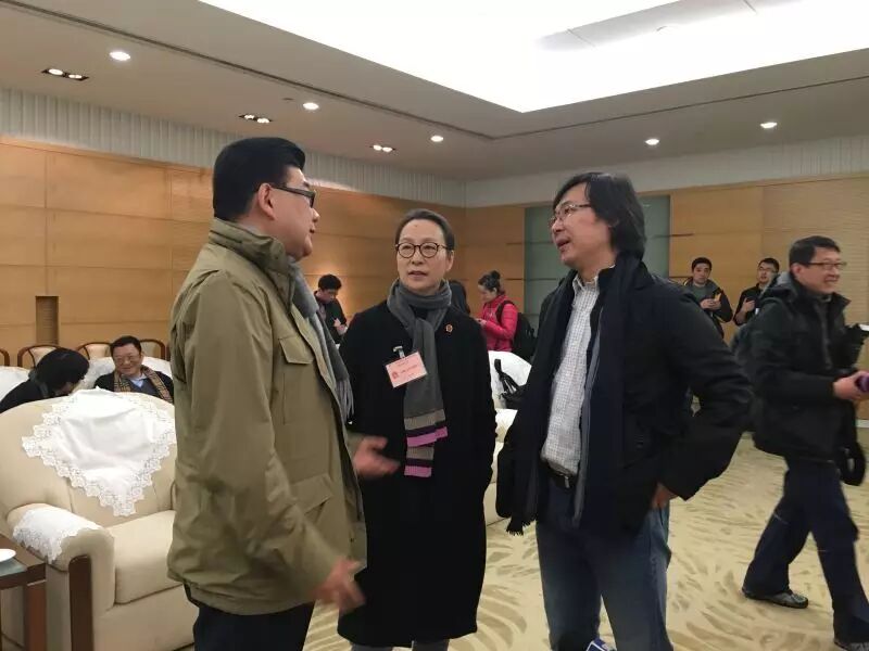 曹可凡代表现场同奚美娟、廖昌永代表热烈交谈
