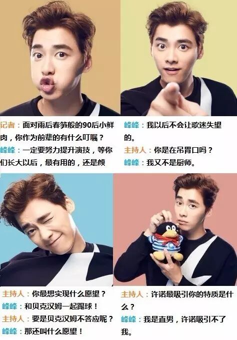 对于颜值这件事,峰峰有话要说!虽然帅是事实,但这样一本正经夸自己帅还毫无违和感,还真是要靠智商啊!别人被问到这种”处男“的问题时肯定觉得好尴尬,而峰峰的天生软萌加机智神回复,真是恨不得献上自己的膝盖。