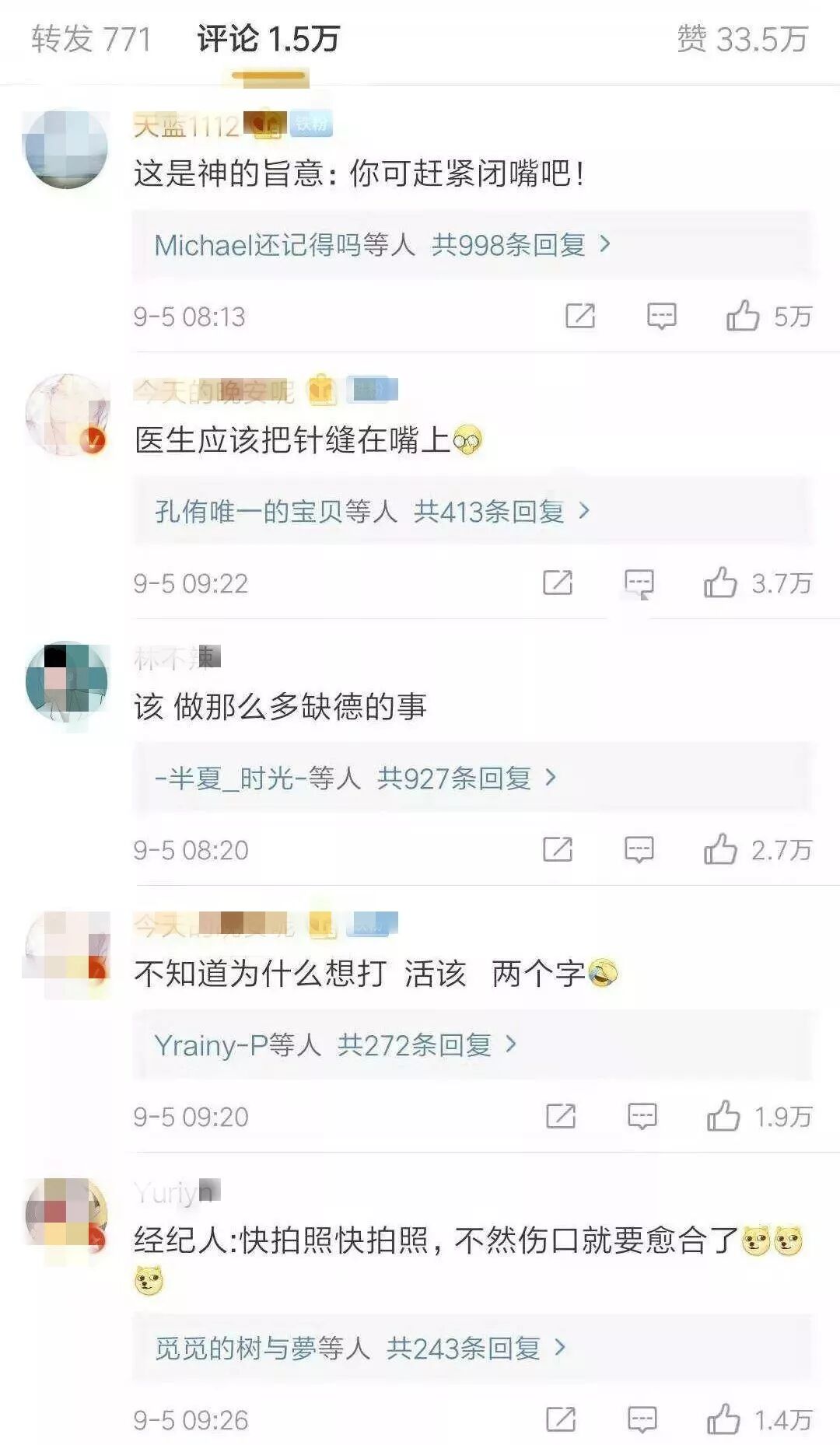 让她赶紧闭嘴的,获赞5万; 让医生把她的嘴缝上的,获赞近4万; 说缺德事干多了的,获赞近3万; 表示“活该”的那条评论,获赞近2万。