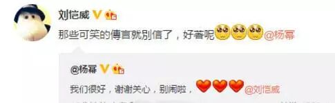 ◆ 2015年11月17日,有爆料称杨幂和刘恺威情变。11月18日下午4点40左右,杨幂发微博表示:“我们很好,谢谢关心,别闹啦。@刘恺威”,随后刘恺威转发了这条微博,直斥传言可笑:“那些可笑的传言就别信了,好着呢。@杨幂”。