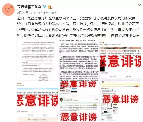 ◆ 2016年2月,杨幂刘恺威陷婚变传闻,杨幂工作室通过微博发律师函,否认炒作离婚等事件,并表示对于诽谤杨幂的不实言论将采取法律手段。