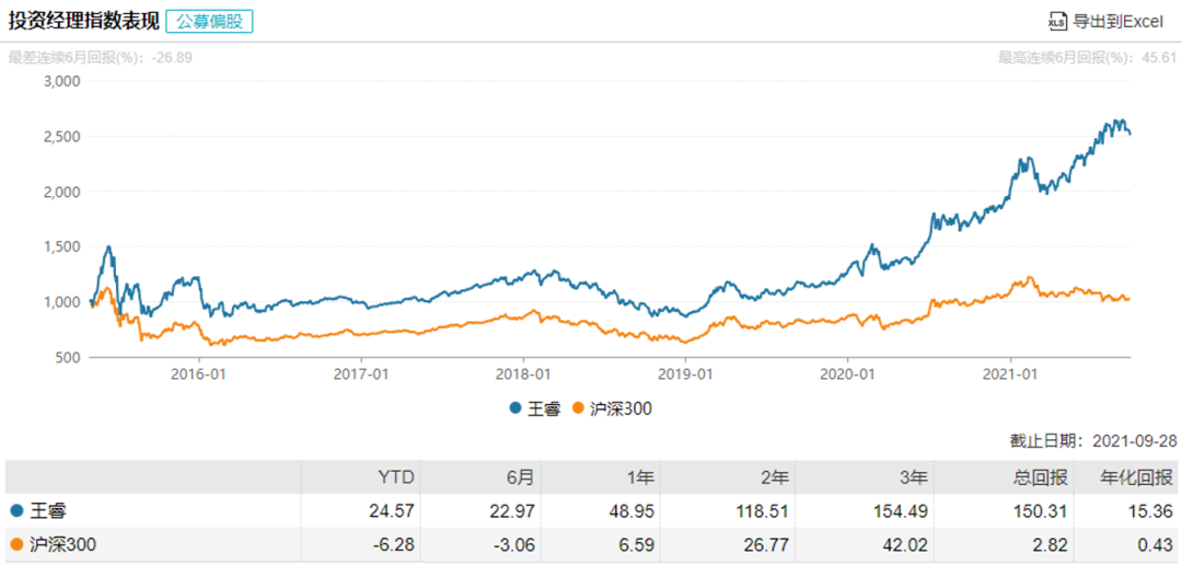 王睿的长期业绩非常好,根据wind投资经理指数,他管理的偏股型基金年化回报达到15.36%,虽然不是很高,但这是在2015年那轮牛市中几乎最高位置开始管理公募产品的,对比同期沪深300指数的年化涨幅只有0.43%,也就说接近6年半的时间,平均每年跑赢沪深300超过15个百分点,2021年的回报达24.57%,对比沪深300今年下跌了6.62% 。