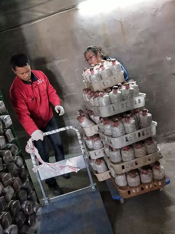 在北京大兴金珠满江黑鸡枞基地好开心农场的菌棒培养室里,一排排绿色的网架上摆满了小心培养的菌棒,轻轻取下观察是否长满菌丝,若菌棒全白则运送拆袋准备春季第二次集中种植,若是菌丝还未长满则轻轻放回不可碰伤以免影响菌丝继续生长。
