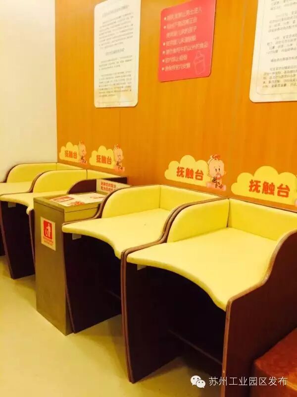华润万家购物中心位于园区津梁街172号,2013年9月开业时,在3楼儿童乐园旁边投资建造母婴室,面积20多平米。母婴室设置抚触台、直饮水(冷热均有)、哺乳休息室,儿童卫生间。