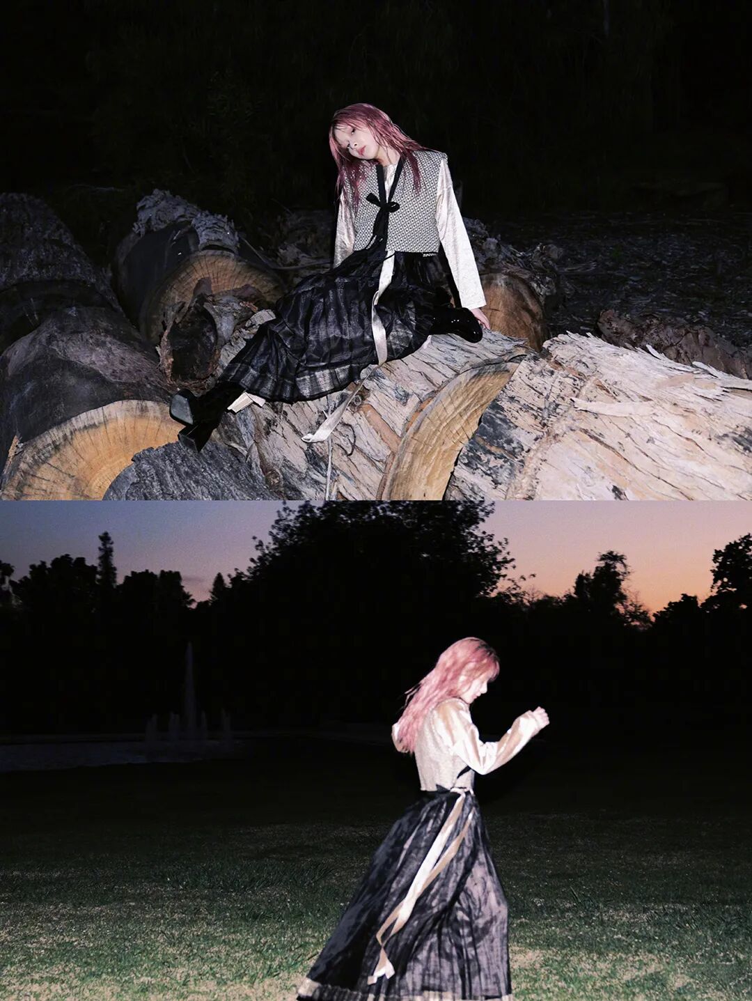 还有这一套新中式改良汉服,搭配粉发,还有一种神秘的前卫感,完全冲破了束缚。衣服选择了黑色和香槟银的配色,让传统的唐褙有了更加现代的生命力。