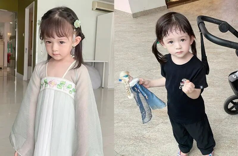 小姑娘生活照萌萌的,换上汉服更是像个小童星,不得不说继承了妈妈的美貌。