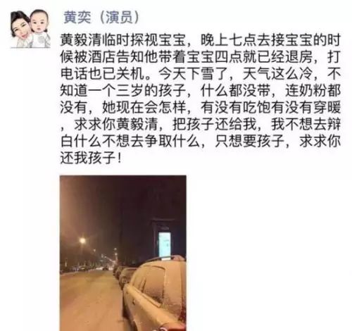 黄奕和黄毅清在痛撕对方终以离婚收场之后,又接着上演夺女大戏。据悉,两人离婚后原本判定女儿由黄奕抚养,但双方恩怨并没就此告一段落。1月16日,网曝黄奕发朋友圈求助,称黄毅清以探视女儿为由私自带女出境,她哀求道:“求求你还我孩子!”并有知情者爆料称黄奕已经报警。