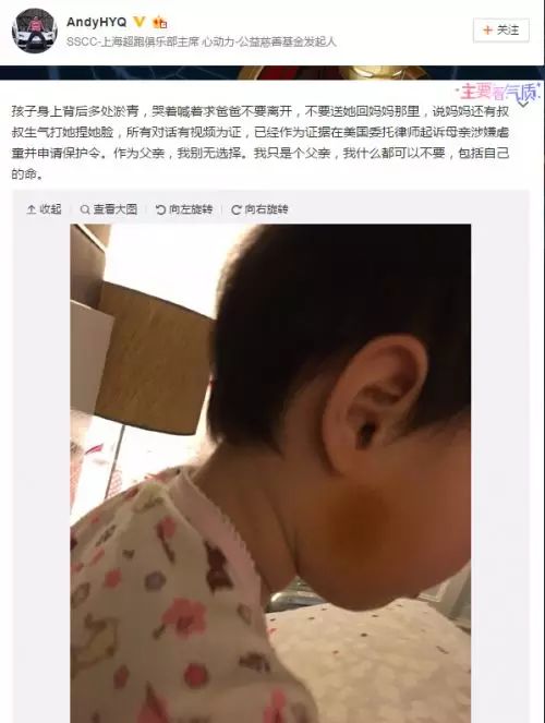 而黄毅清所拍的女儿铛铛脸上的淤青在16日探视当天都还没有,“16号上午11点黄奕和女儿在世贸天阶一起拍摄杂志《时尚健康》,当时女儿脸上并无伤痕,所有工作人员都可以作证。”事发突然,但黄奕方面表示,会继续全力寻找女儿,并寻求法律手段解决这次事件。