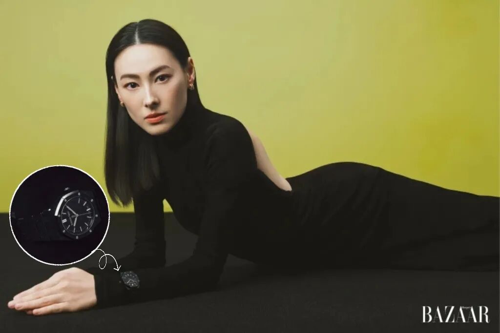 今年1月又高调登上港版《时尚芭莎》开年刊封面,身穿克莱因蓝Tom Ford斗篷,佩戴同色系爱彼皇橡系列万年历陶瓷腕表,耳畔超大的银色金属耳环来自Gucci,衬得整个人更显英气。