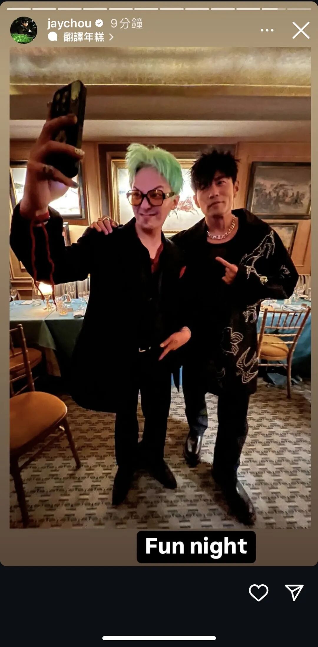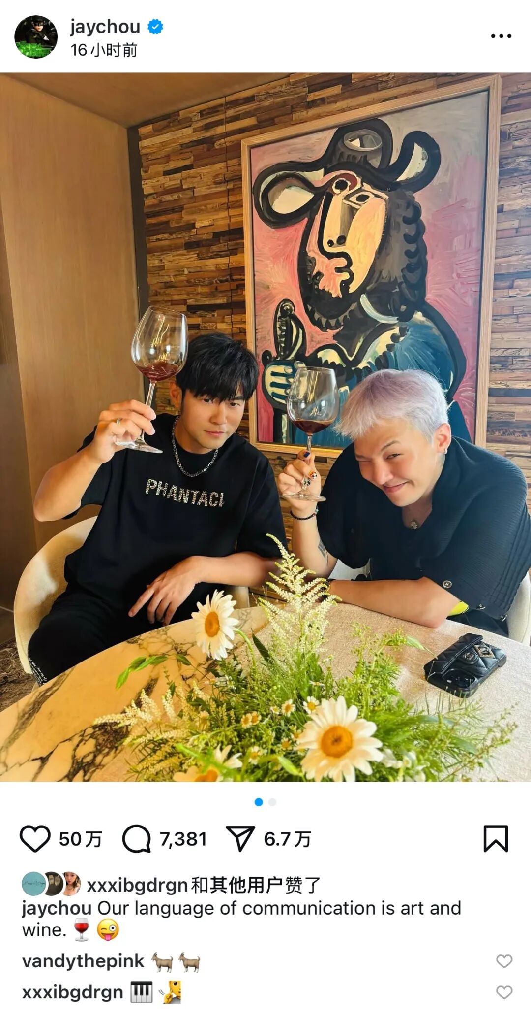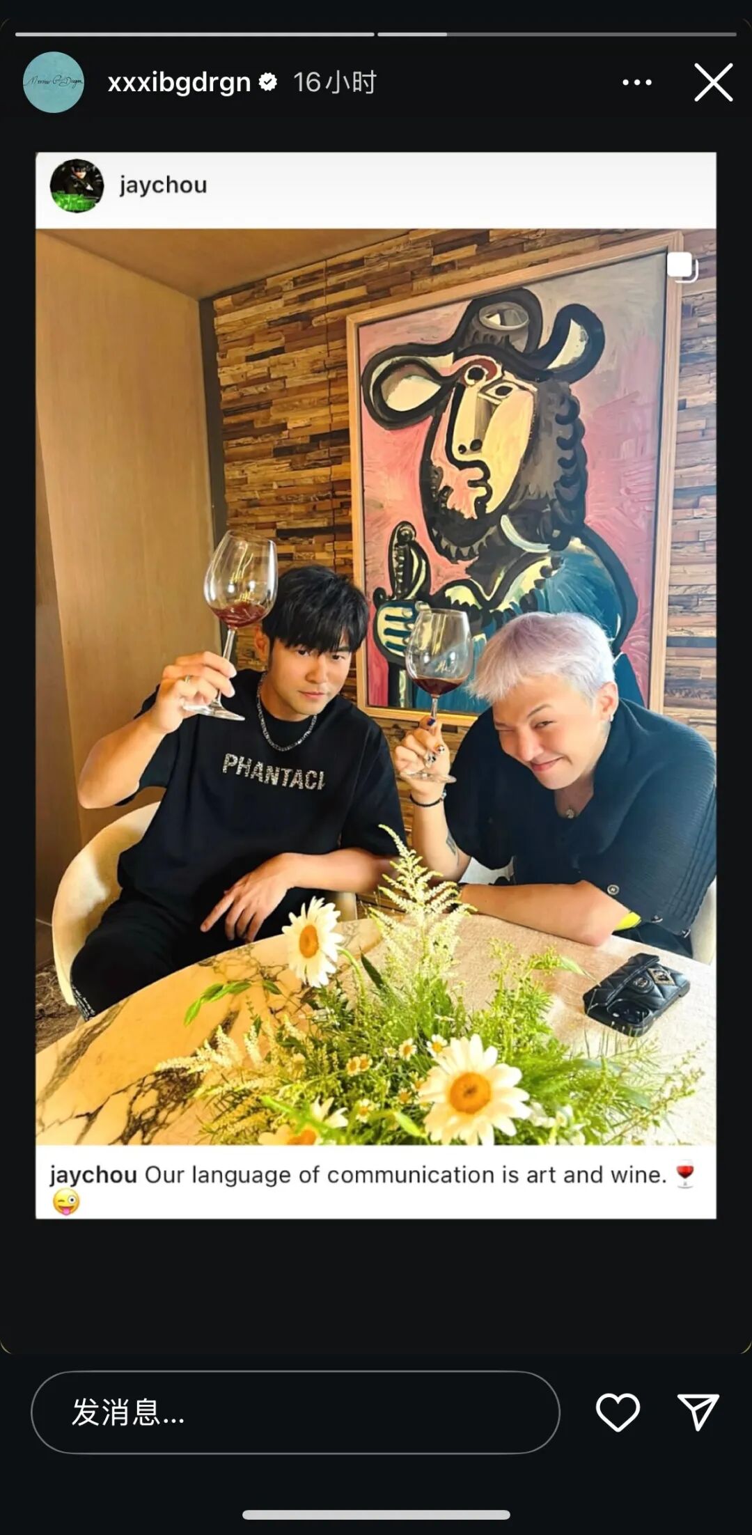 稍早周董再度晒出和权志龙的合照2.0版本,还写下「Our language of communication is art and wine 我们交流用的语言是艺术和红酒」,依旧相当装X啊~